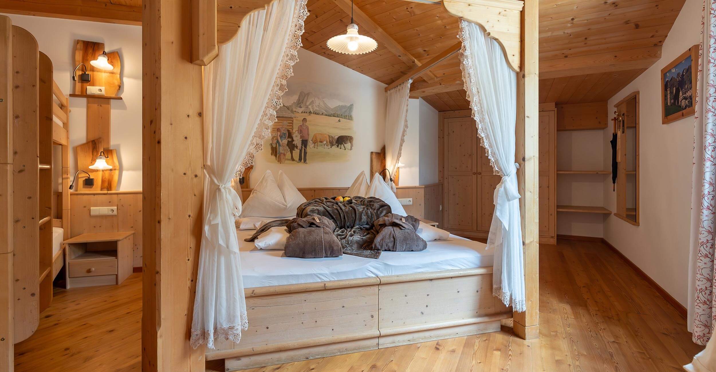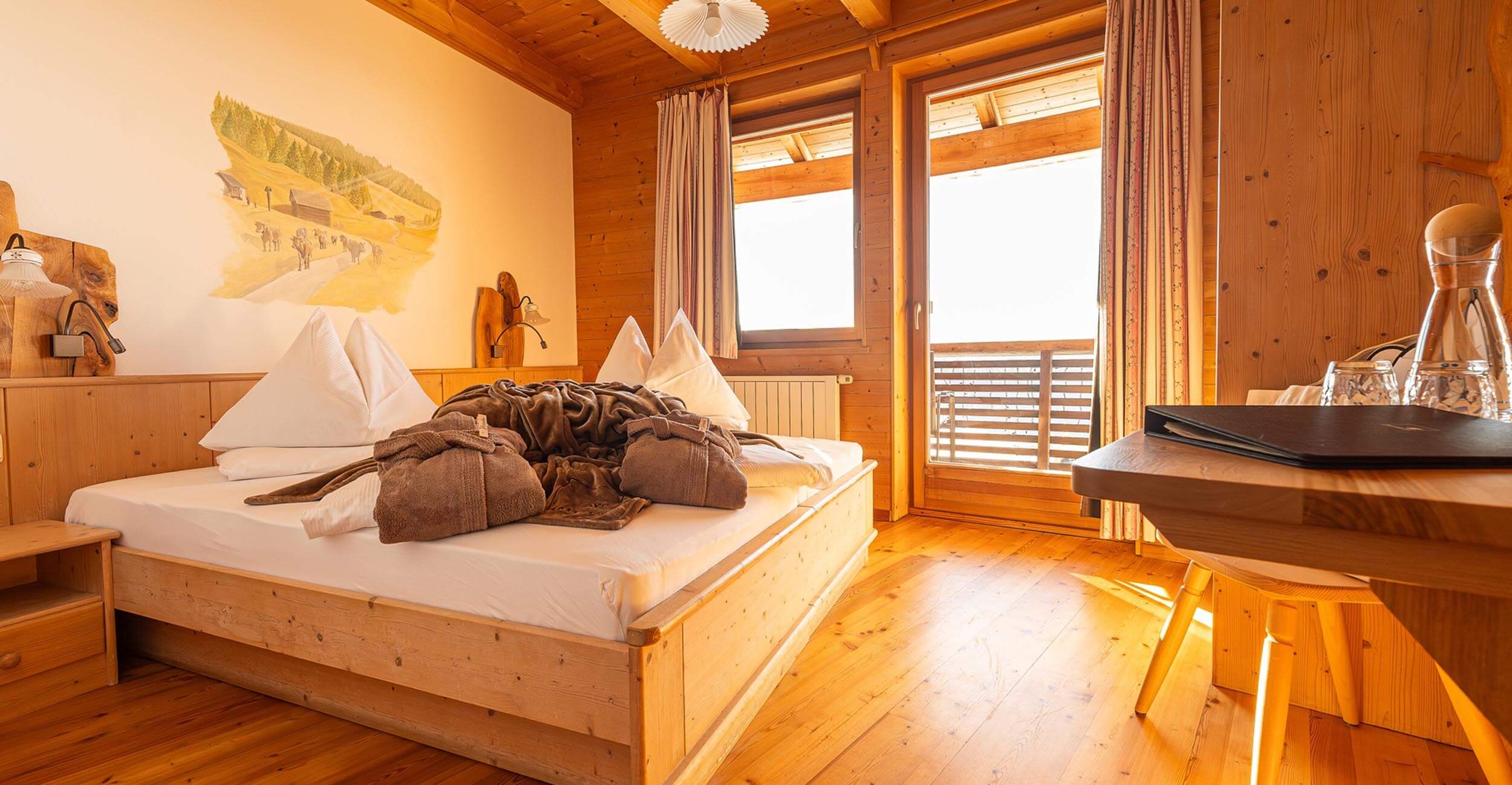 Durante il vostro soggiorno, nella camera prenotata vi attendono soffici accappatoi, pantofole da bagno e altri piccoli comfort – per garantirvi ancora più comodità e benessere in malga.